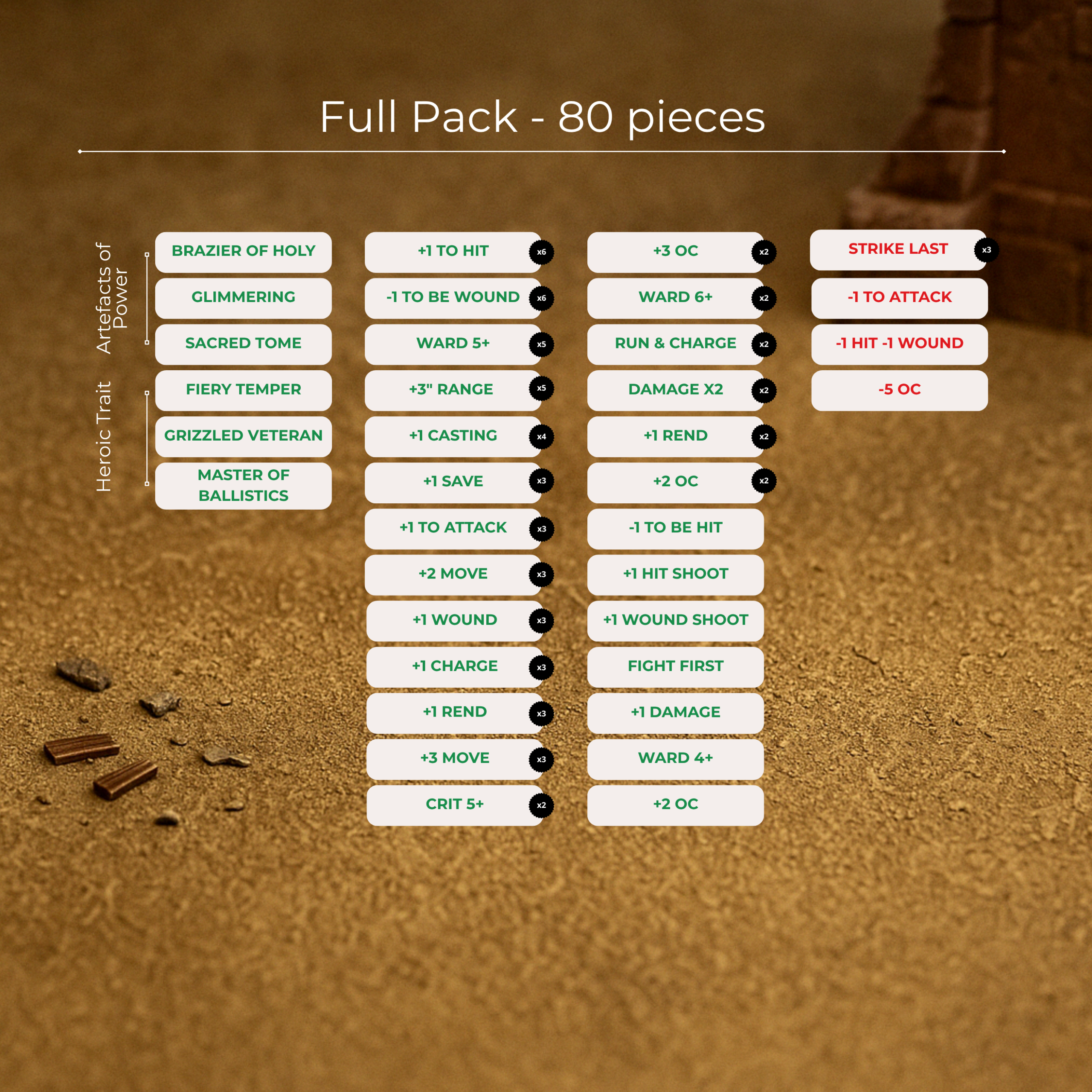 Chaque wargame tokens vous aide à suivre facilement les effets actifs pendant la bataille : buffs, debuffs, pouvoirs, capacités spéciales ou objectifs. Plus besoin de mémoriser chaque règle en pleine partie.