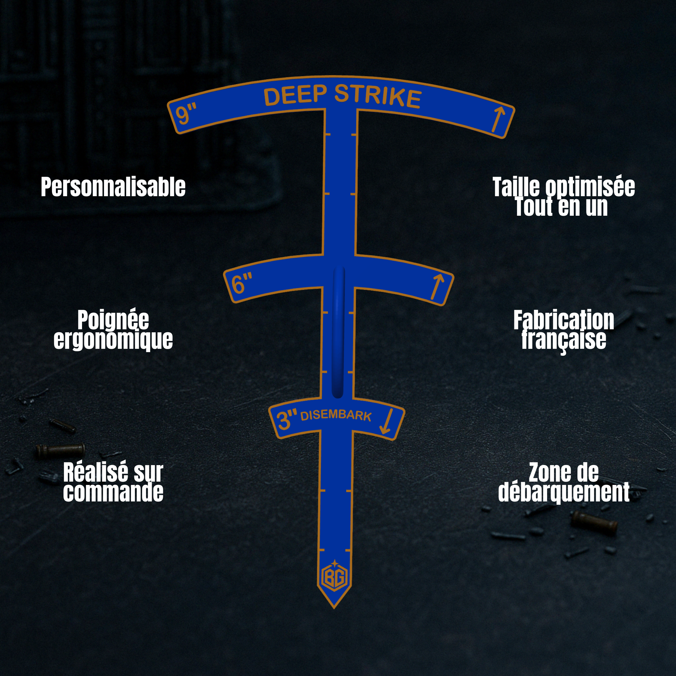 Cette règle de mesure tout en un est l’outil parfait pour les deep strike (frappes en profondeur) qu’elles soient à 6 ou 9 pouces. Il vous permettra aussi de débarquer proprement des angles de vos véhicules grâce à l’adjonction d’une zone à 3 pouces. Un accessoire parfait pour vos parties de jeu de figurines WH40K. Plus besoin de multiplier les accessoires et de vous encombrer, ce seul et unique outil vous permettra de faire face à toutes les situations du champ de bataille.