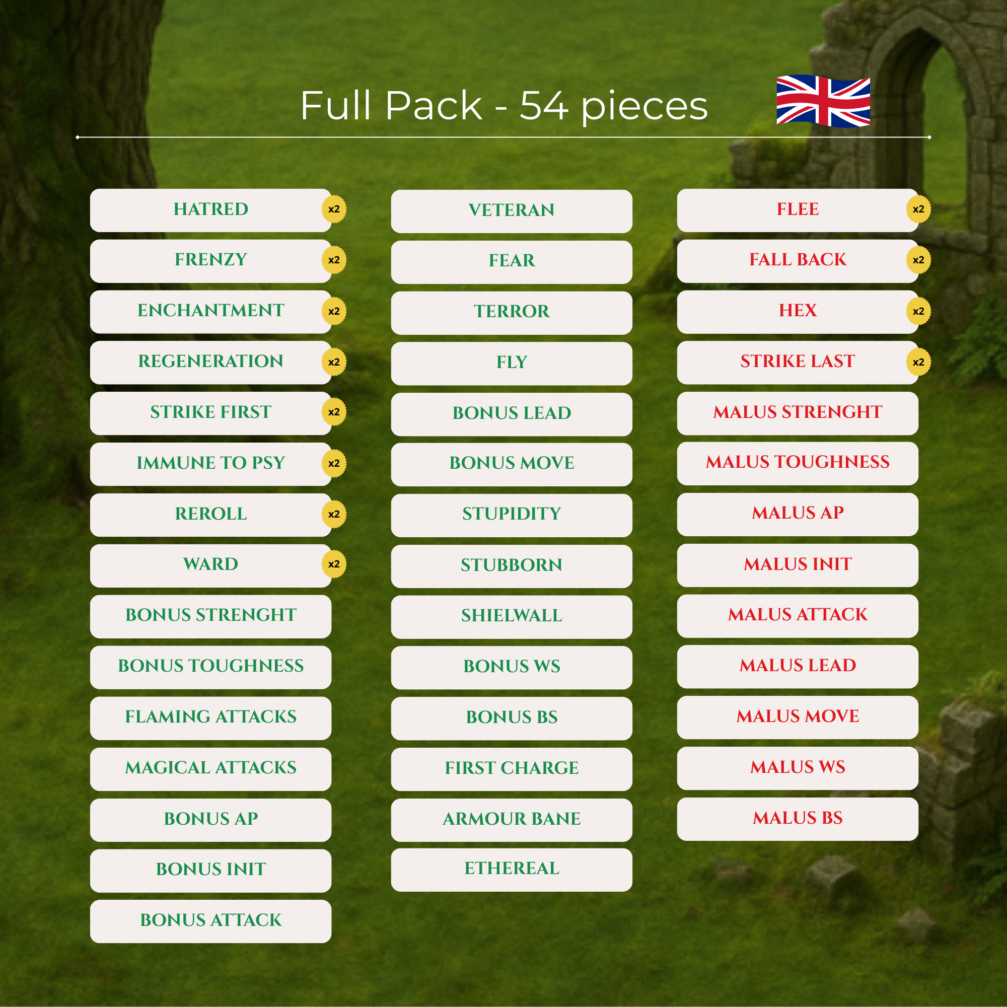 Plongez dans l’atmosphère épique de l’Ancien Monde avec ce set de tokens tactiques, spécialement conçu pour accompagner vos armées du jeu The Old World / Old Fantasy.