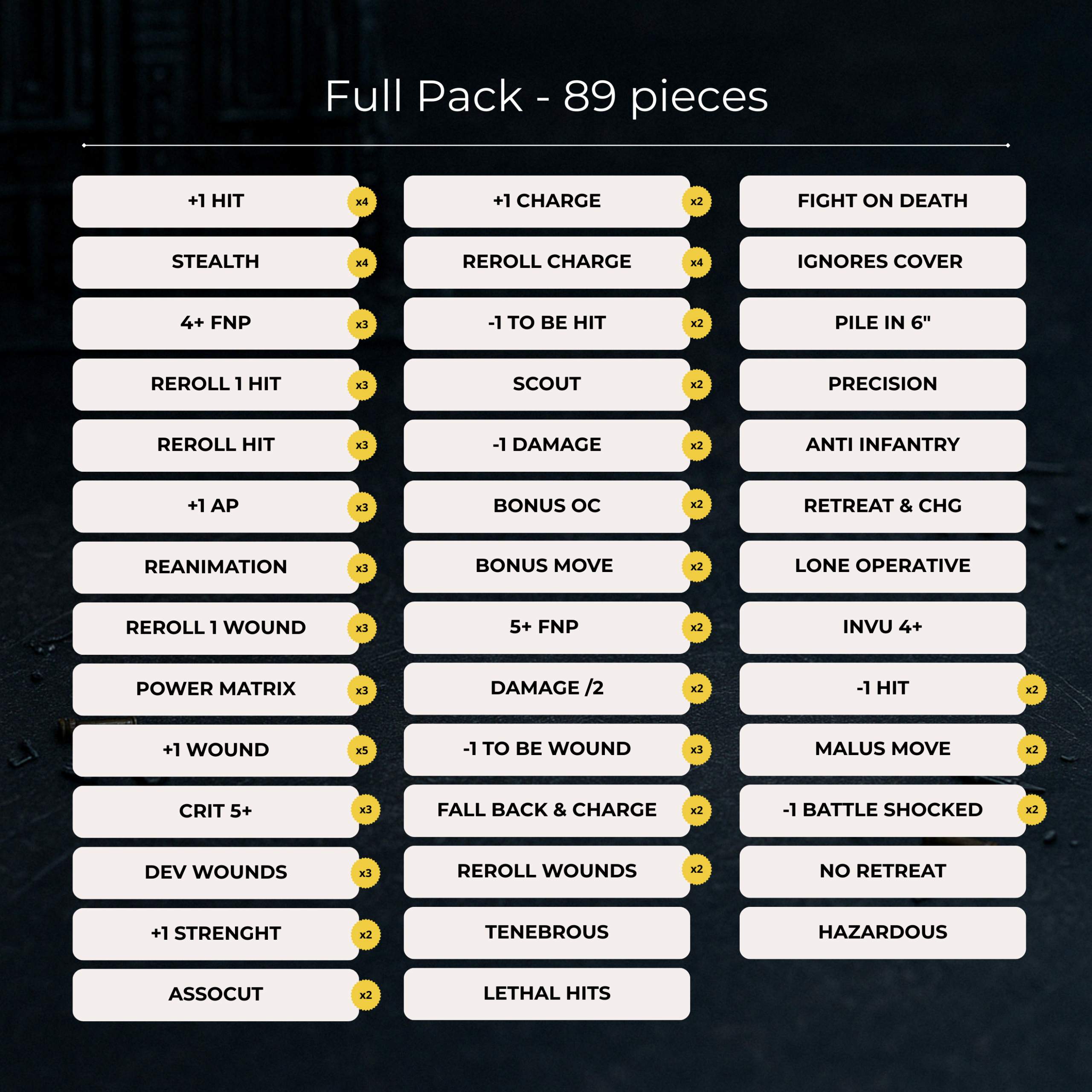 Particulièrement utile pour les armées utilisant de nombreux pouvoirs ou capacités.