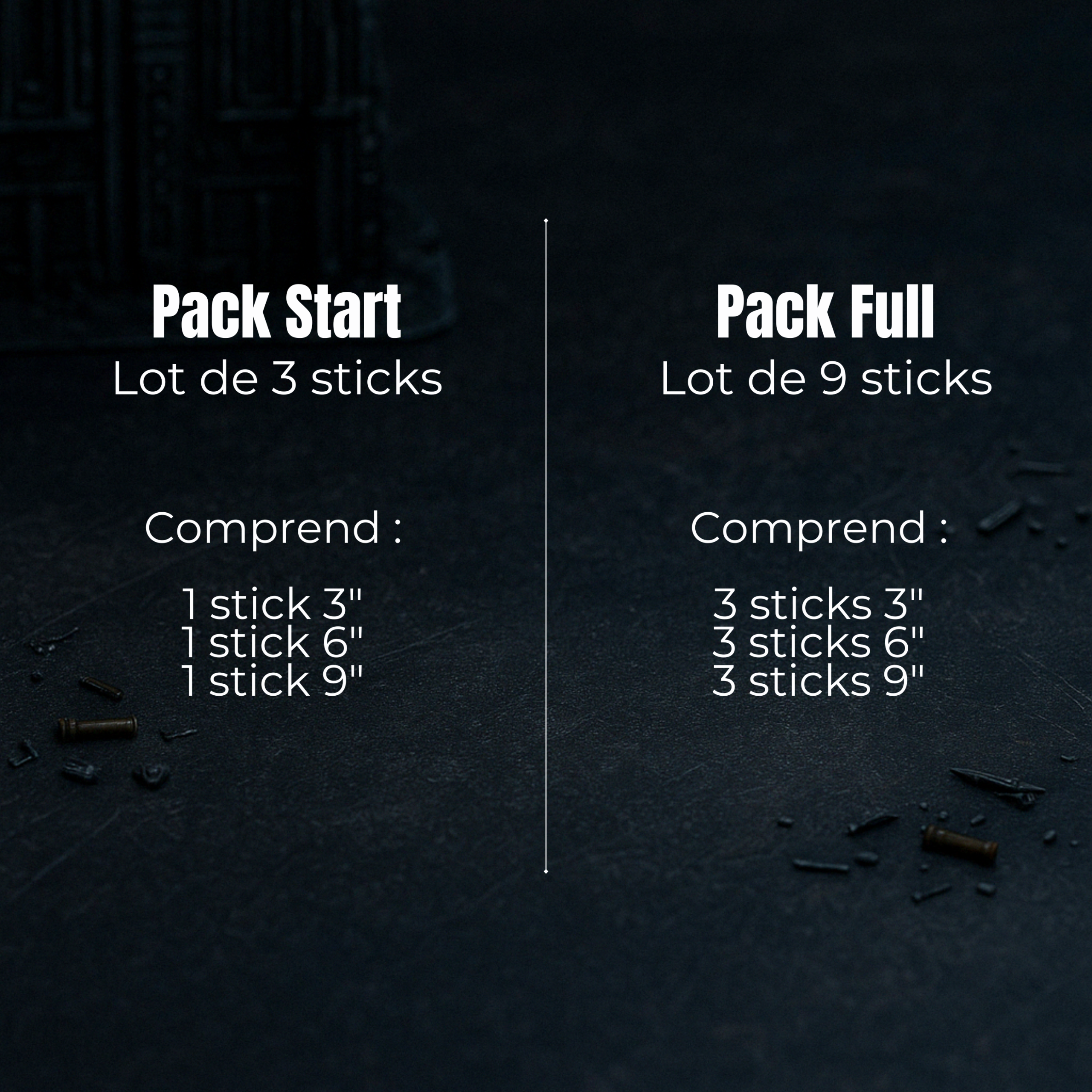 Disponibles en 3", 6" et 9", mes sticks peuvent être achetés à l’unité ou en packs, selon vos besoins :